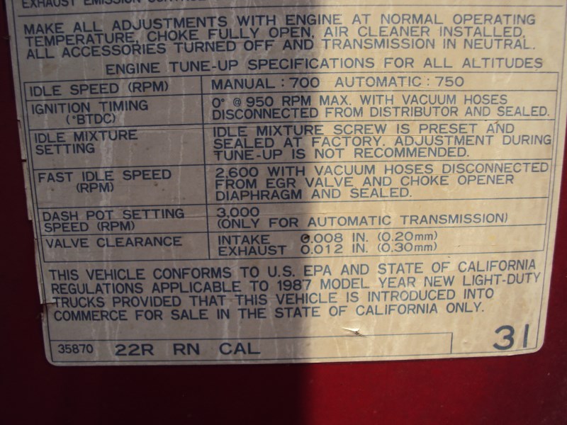 1987 TOYOTA PICK UP TRUCK REGULAR CAB STANDARD MODEL 2.4L CARBURETOR MT 5 SPEED 2WD COLOR RED Z134891987 TOYOTA PICK UP TRUCK REGULAR CAB STANDARD MODEL 2.4L CARBURETOR MT 5 SPEED 2WD COLOR RED Z13489