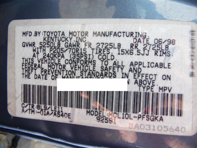 1998 TOYOTA SIENNA XLE SKY BLUE 3.0L AT Z176671998 TOYOTA SIENNA XLE SKY BLUE 3.0L AT Z17667