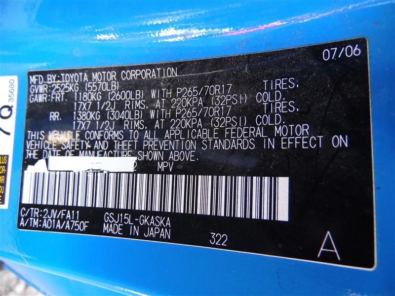 2007 TOYOTA FJ CRUISER STD BLUE 4.0 AT 4WD Z213702007 TOYOTA FJ CRUISER STD BLUE 4.0 AT 4WD Z21370