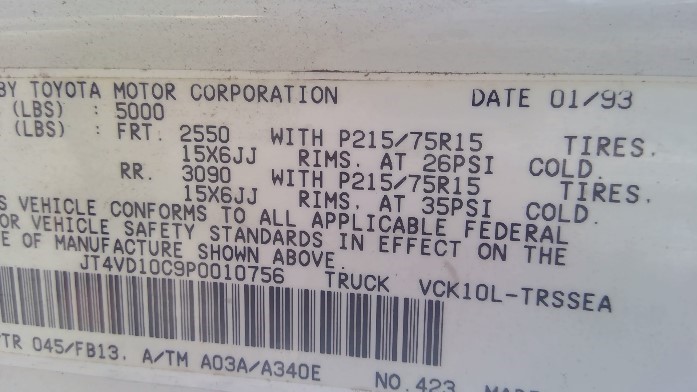 1993 TOYOTA T100 WHITE SR5 STD CAB 3.4L, 2WD.  Z248621993 TOYOTA T100 WHITE SR5 STD CAB 3.4L, 2WD.  Z24862