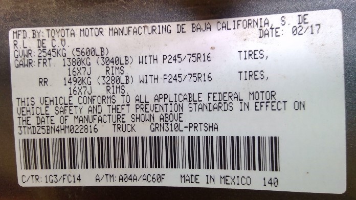 Make : TOYOTA TACOMA, SR5 Interior Color: GRAY